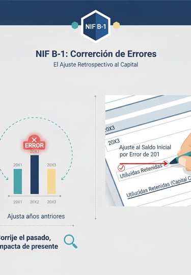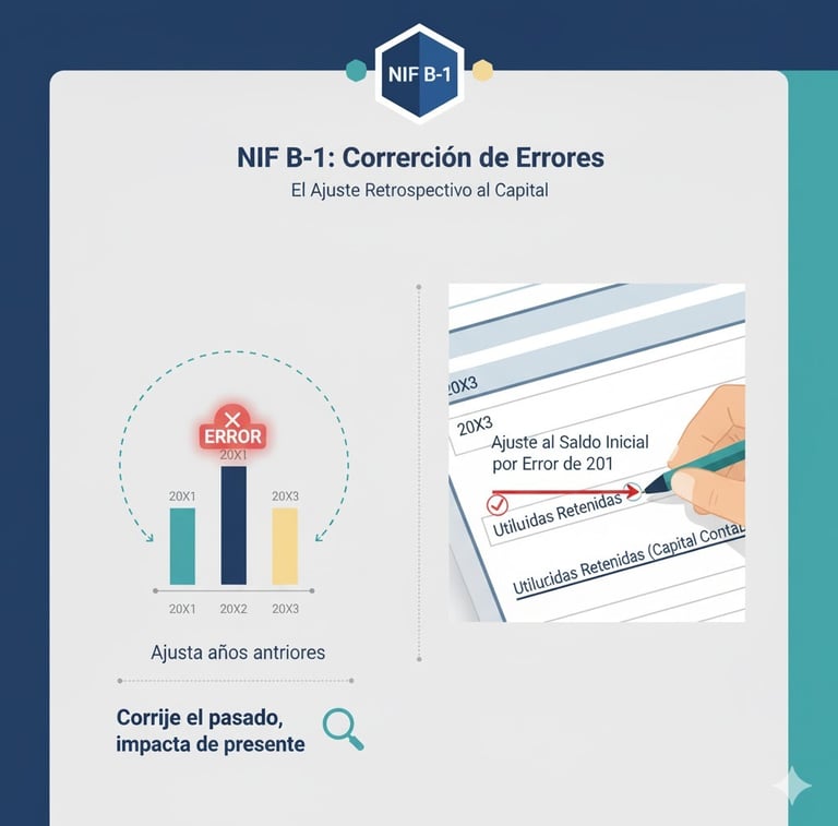 Ajuste al Capital: El efecto acumulado de la corrección de errores de años muy lejanos se ajusta directamente al saldo inicial de las Utilidades Retenidas (una cuenta del Capital Contable).